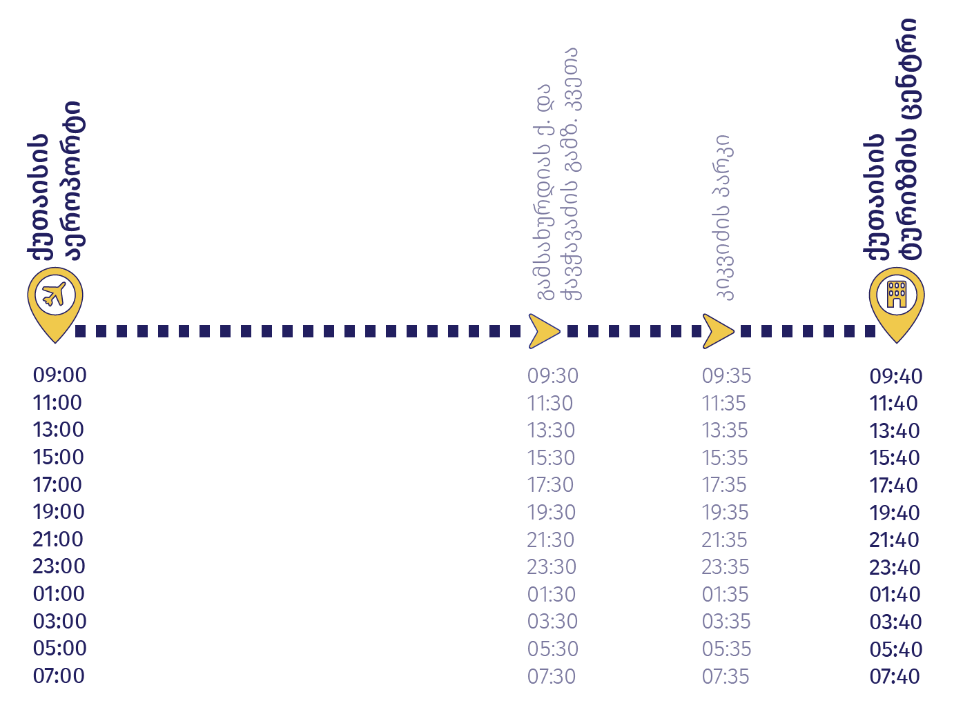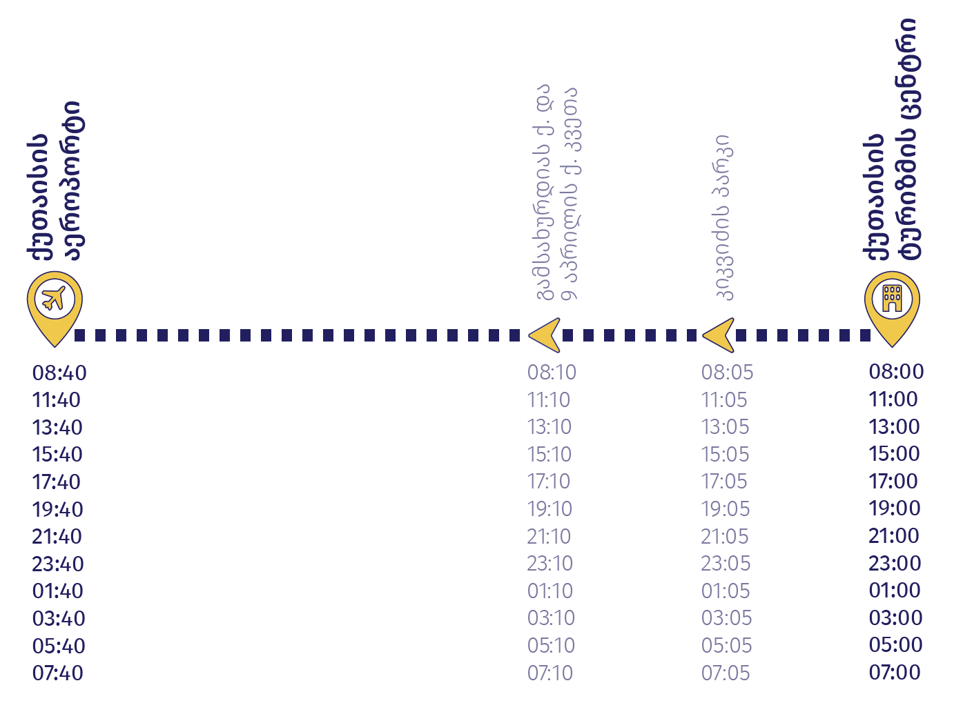 აეროპორტის Shuttle Bus სერვისი ქუთაისის აეროპორტიდან ქუთაისის ქალაქის ცენტრის მიმართულებით და პირიქით.